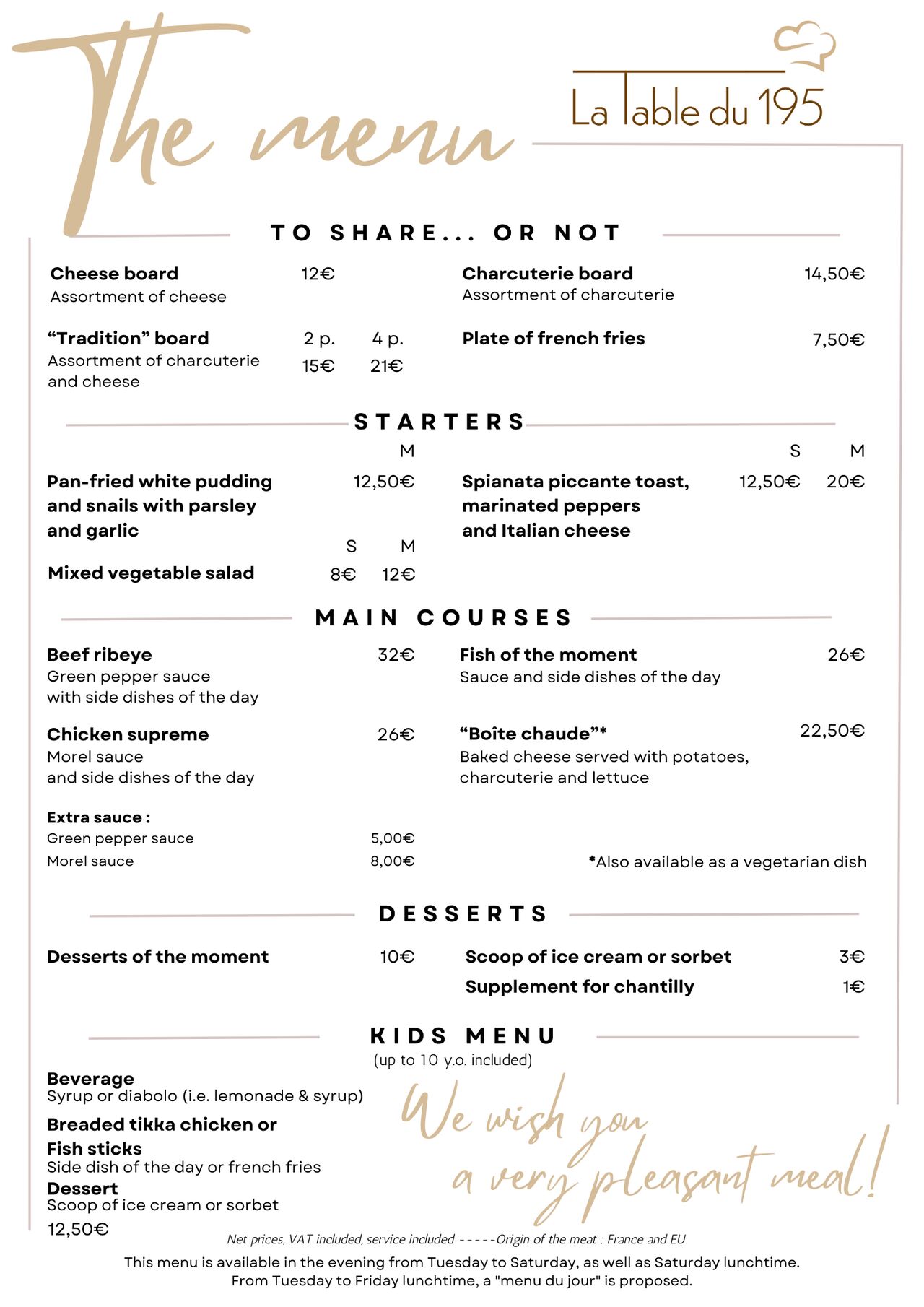 Du mardi au samedi soir, et le samedi midi